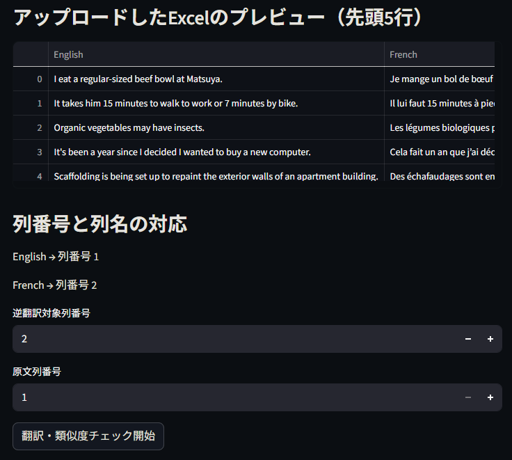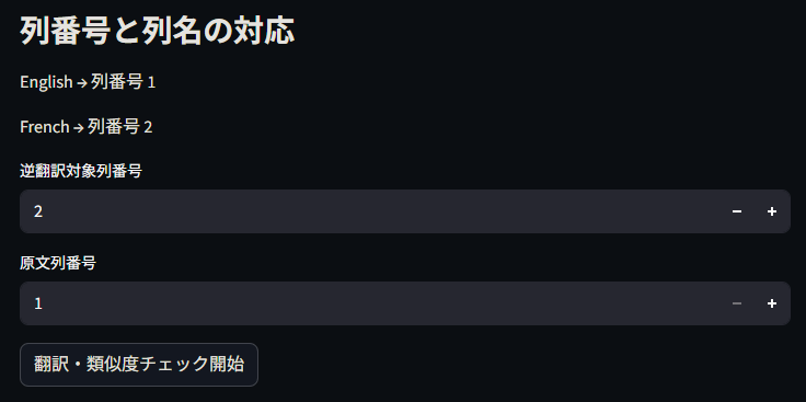 5.対象の列を選択し、[翻訳・類似度チェック開始]をクリックします。