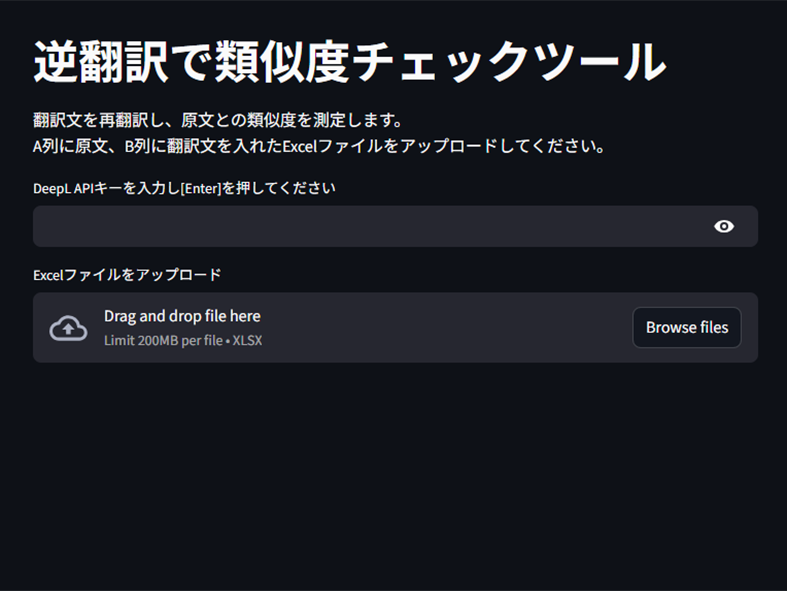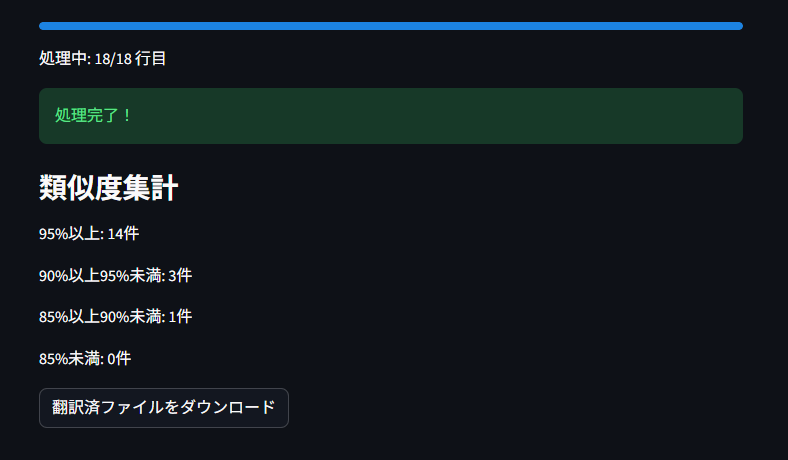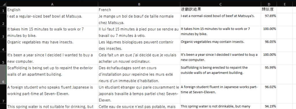 機械翻訳(DeepL)を使用して訳文を逆翻訳し、原文(英語)と逆翻訳結果(英語)をAIで比較して類似度を算出し、類似度を%で表示できます。100%に近いほど「内容が似てる」というものです。